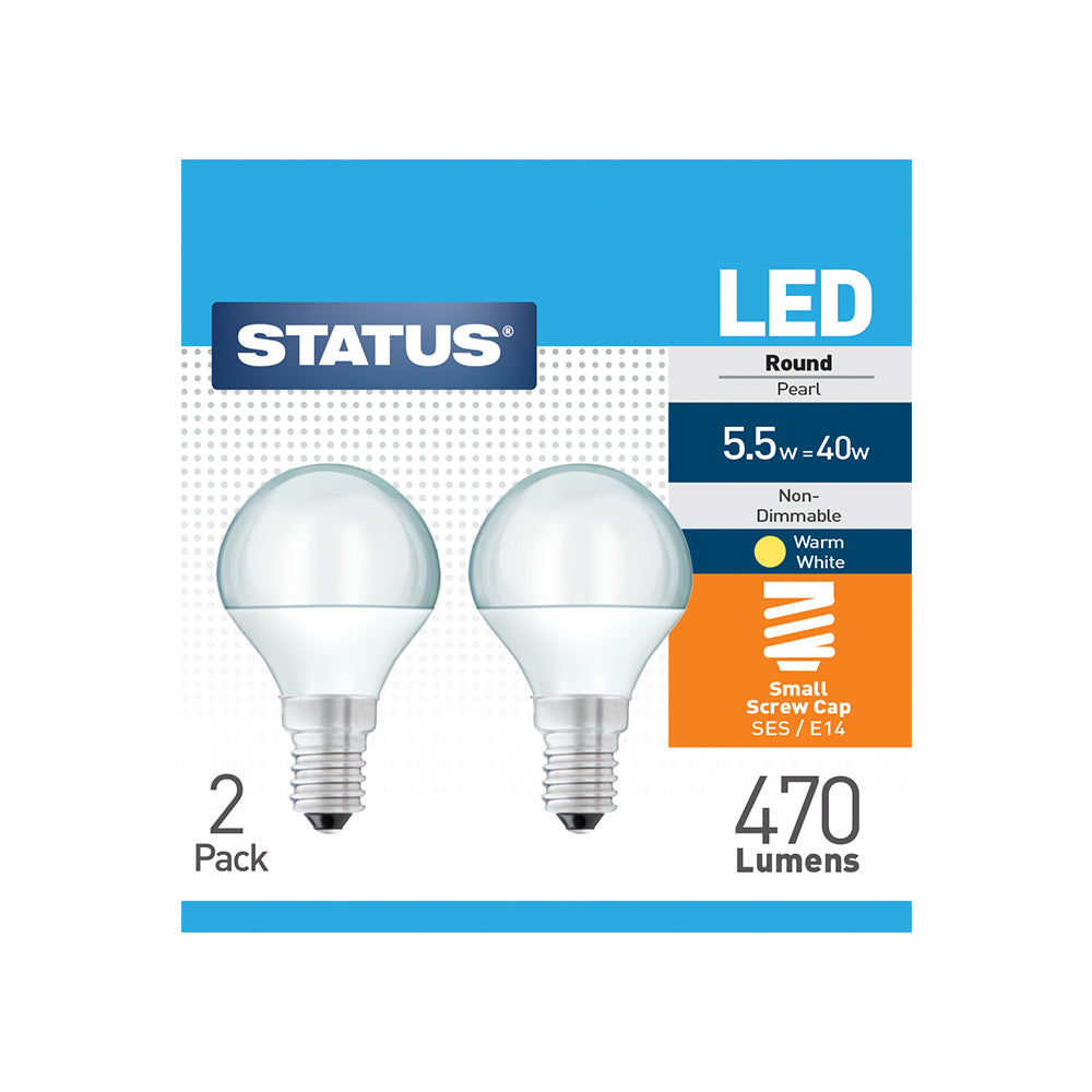 5.5w = 40w = 470 lumens - LED - Round - SES - PA - Pearl - Warm White - 2 pk box