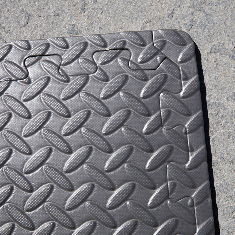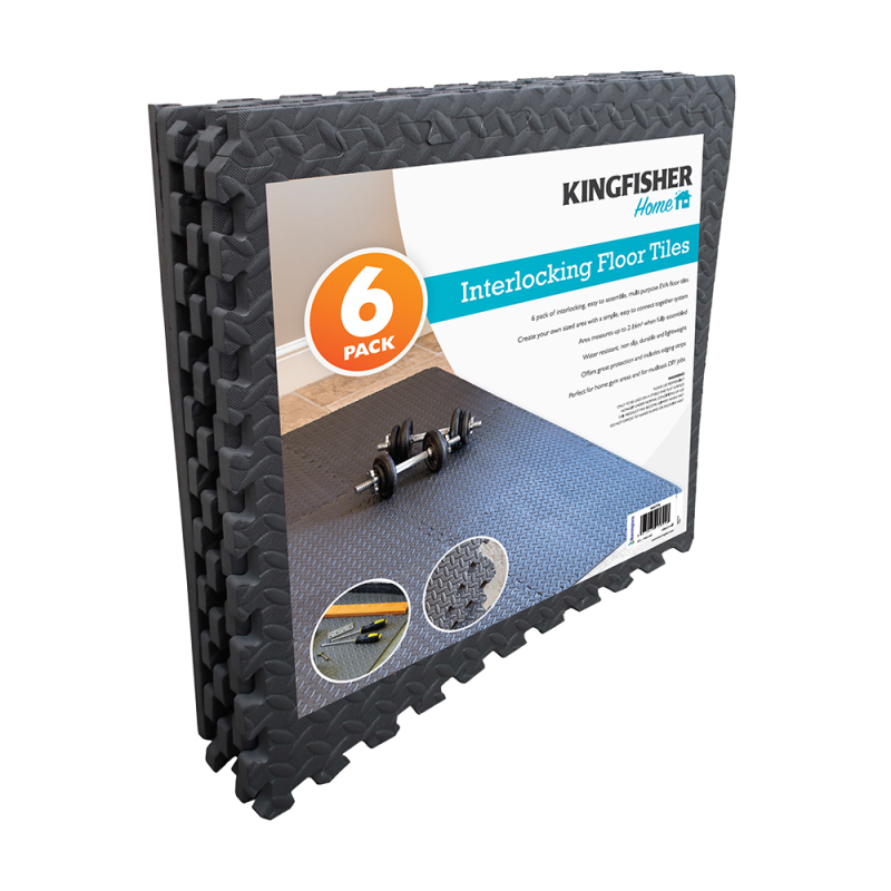 6 piece EVA foam grey floor tiles set. Easy to assemble. Provides an insulating, comfortable and shock absorbing surface. Each tile 61 x 61 x 1cm. Covers 2.16sqm. Shrink wrapped with a full colour insert label.